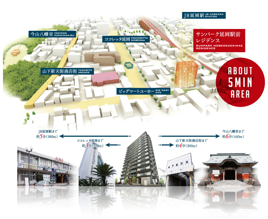 JR延岡駅前は、多くの人が集まり、行き交う延岡の中心です。通勤や通学のアクセスの拠点としてはもちろん、ショッピングやグルメ、ビジネスなど、あらゆる都市機能が集積。日々の暮らしに必要なライフコンテンツを満たす多彩な都市機能が充実した街は、「暮らしを愉しむ場所」としても魅力が満載です。